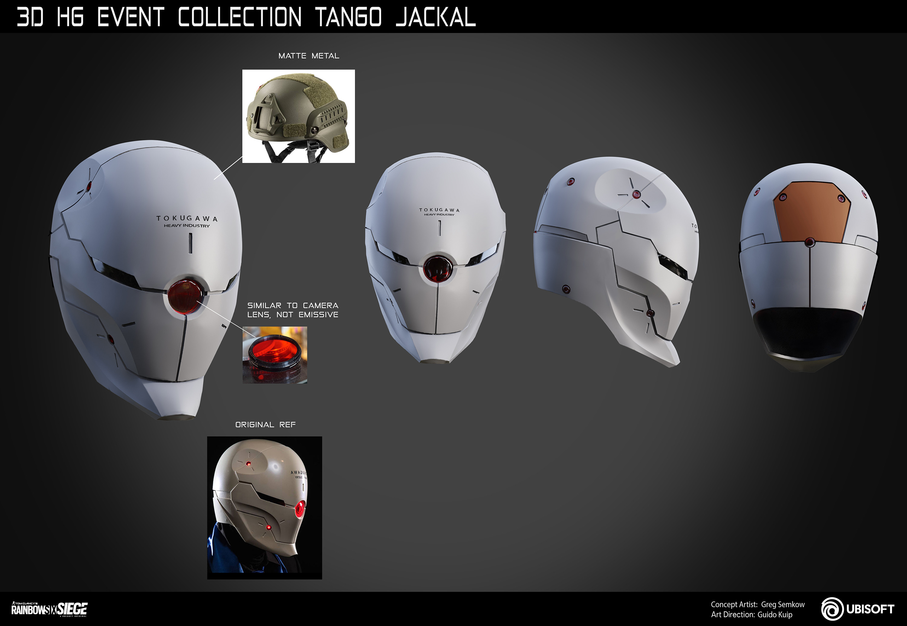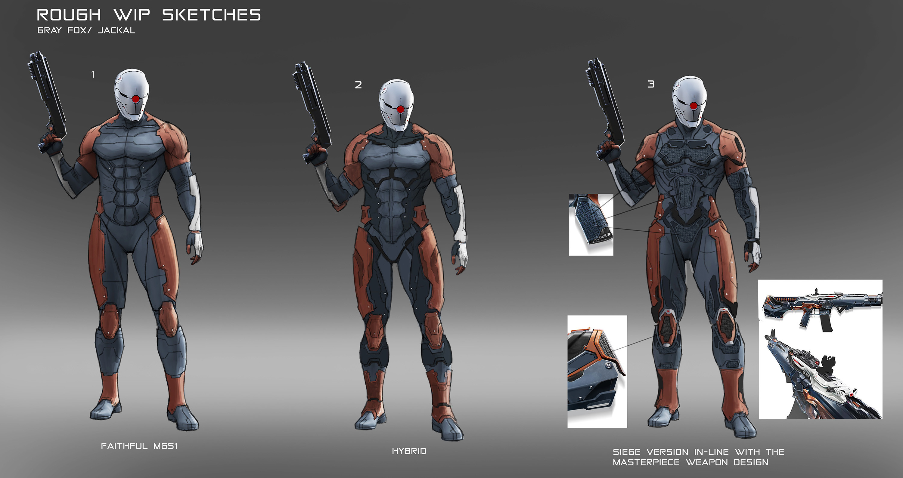 My Grey Fox design for the Rainbow Six Siege / Metal Gear Solid collaboration. Final designs, callouts, head gear turnaround, material callouts, and initial sketches.